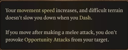 For your final Feat unlock Mobile. Mobile allows you to move 3m more per turn, cannot provoke Opportunity Attacks if you move after making a melee attack and when you Dash, Difficult Terrain does not slow you down.