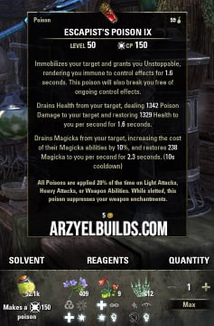 Powerful Poison for PVP Builds with two different versions. It immobilizes your target and grants you Unstoppable(Immune to Crowd Control effects), deals poison damage while healing you, increases the cost of your enemy’s Magicka or Stamina abilities while restoring Magicka or Stamina to you, depending on the Poison’s version. To craft the Magicka version combine Bugloss, Columbine and Namira’s Rot or Wormwood.