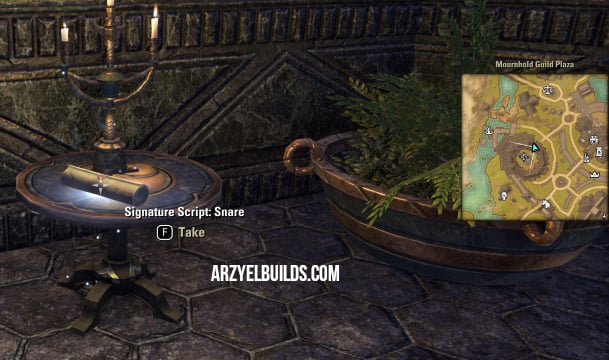 The Hunter’s Snare Script is in the Mournhold Mages Guild Hall, in the Deshaan zone, right before you enter the building.